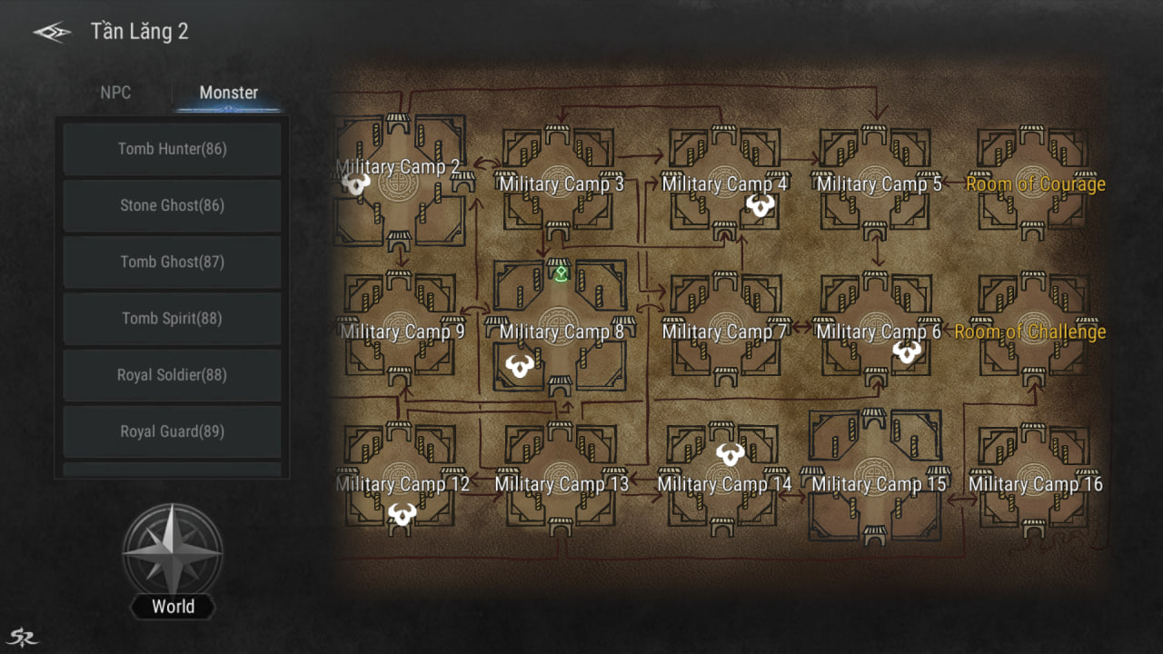 - Contains 16 rooms, corresponding to 16 camps. Camps may or may not connect with each other.
